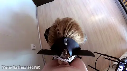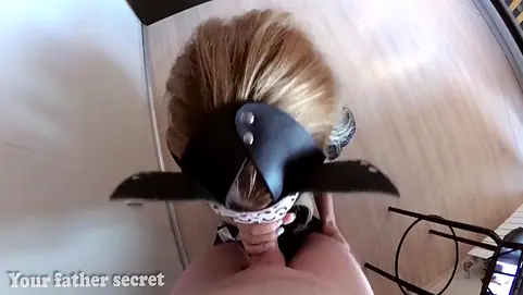 Lovely teenage chick with mask deep throats beef whistle and gets spunk on her face, deep throat